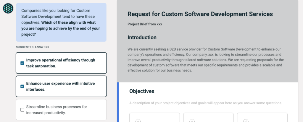 At the end of the form, you end up with a set of proposed service providers. The companies are connected directly with the answers, you have given in the form. You can submit the brief to all selected firms and wait for their response.