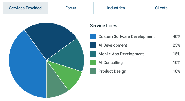 These data might tell you a bit about the company and what they are doing, but Clutch forces us to put something up to 100%. I honestly don’t know what is better – put 100% into custom software development, as this is what we do, or put fragmentation into different areas because we also do web dev, mobile dev etc.